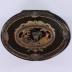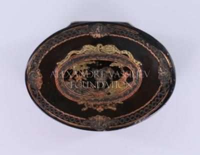 Oval snuff box in lacquered wood and silver mounted frame. Its lid is inlaid with silver hunting theme motifs representing a dog, a gun, a dead bird, surrounded with flowers and leaves.