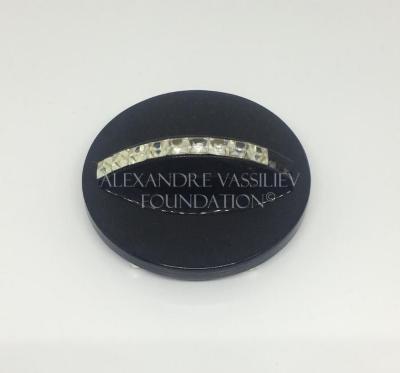 Round belt buckle in black celluloid decorated with rhinestones.