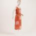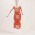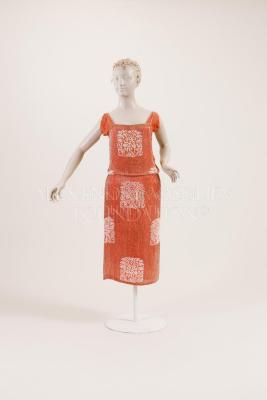 Salmon color silk chiffon sleeveless evening dress with labeled ceinture (waist stay) ribbon, embroidered in square floral compositions with silver and white pearl bugles.