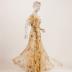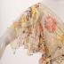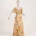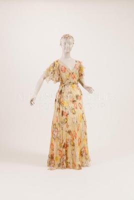 A floral printed chiffon garden party bias-cut cocktail dress of pale primrose chiffon with flounced sleeves and ties across the bodice, with champagne silk crepe underdress.