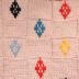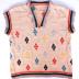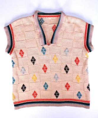 Sleeveless upper body garment for men made from handmade cotton knit. The collar and armholes are enhanced with a ribbed edge with a multi-colored blue, black and red line. The rest of the garment is made with checkerboard stitch and features a multi-color quadricross pattern.