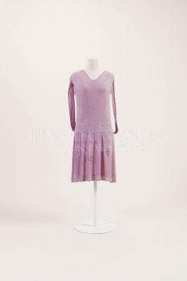 Lavender crepe georgette short Art Deco style gown, embroidered with glass beads in vermicular rosettes and the borders at the waistland and at the hem, with pleated chiffon bows on the shoulders.