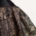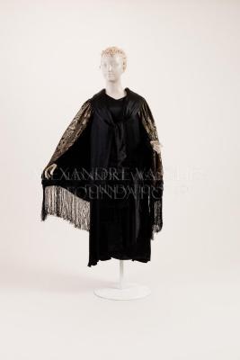 Gold and black brocade opera cape with black silk satin shawl collar, trimmed with black silk pleated satin and black silk fringe at the hem.