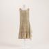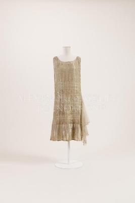 Flapper style gold guipure lace evening dress with Egyptian motifs, metallic tulle hem detail and gold lamé underdress.