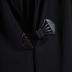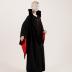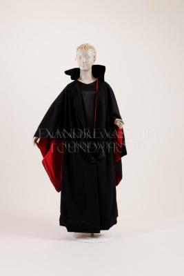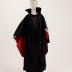 Black macfarlane coat with shoulder cape attached at the neck and a detachable high collar made of black plush, lotus-shaped bakelite buckle clasp, lined with crimson silk.