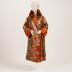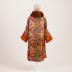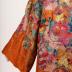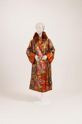 Silk brocade evening coat with woven and printed watercolor floral design on copper background, cognac fur collar, single self-button and loop closure, yellow silk lining with ruched inner pocket.