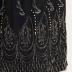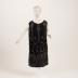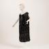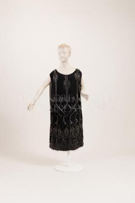 Black silk chiffon apron dress, the halves of which are connected on the sides by short beaded straps, front and back chain stitched with transparent and black bugles, artificial pearls, black silk thread in stylized paisley motifs, with a fringe of bead loops along the hem.