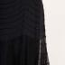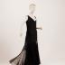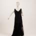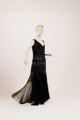 Black silk crepe evening gown to the floor, sleeveless, handkerchief tulle overskirt attached at the hips; the bodice and skirt embroidered with black bugle waves.
