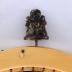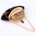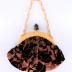 Women's velvet purse with celluloid clasp and handle. The fabric of the purse represents large black flowers on a salmon and bronze background while inside the fabric is a cream-colored flower. The clasp is decorated with a Buddha figurine.