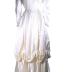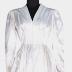 Ivory satin wedding gown consisting of a top and a skirt. The top has long sleeves, fitted waist and V-neckline closing with a zip in the back. The voluminous bottom as a skirt is decorated with draped pleats and decorative bows at the hem. An underskirt in composed by a mesh fabric and ivory satin allows to obtain length and touch the ground.