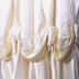 Ivory satin wedding gown composed with long sleeves, a fitted waistline, and a V-neckline. The voluminous skirt is adorned with draped pleats and decorative knots at the hem.