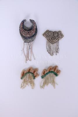 Set of four hand-beaded embroidery samples. These consist of a blue crescent motif, a silver trapezoid, and two botanical crown motifs in green and beige. All four are constructed of glass beads on a tulle base with cotton threads. They are all four embellished with beaded fringe.