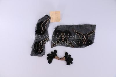 Set of three handmade embroideries featuring stylized bird wing motifs. One design features two individual wings, another two connected wings, and the third is a pair of double wings. The embroideries are crafted with black and gold glass beads on black tulle base.