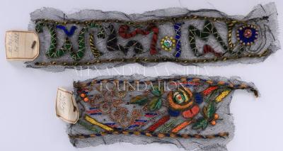 Set of two handmade embroideries. One features stylised playful lettering or zigzag patterns in a colorful thread with metallic gold and silver webbing throughout. The second features a multicolored flower with leaves, swirls and stripes. It is crafted with short and long glass beads, glass cabochons, silver metal threads, and silk cords on a tulle base.