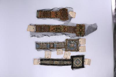 Set of four hand beaded embroideries featuring sectioned geometric patterns. Two consist of floral and foliate motifs; one is primarily orange, the other is primarily green. Two consist of more geometric designs both in blue and gold; one is more circular with scrolled motifs, one is more rectangular with black borders. All are crafted with short and long glass beads, rhinestones, faceted glass cabochons, gold metal threads and silk cords on a tulle base.
