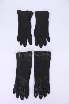 Two pairs of woman's gloves made of unlined black leather, and two individual gloves, one with darting.