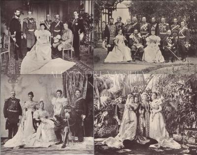 Set of 11 photolithographs around 1890-1900 depicting members of the imperial family related to Grand Duchess Olga Constantinovna of Russia, including guests at the wedding of Grand Duchess Anastasia Mikhailovna of Russia. Also including groups of men in uniform, clergy, state officers, American delegation.