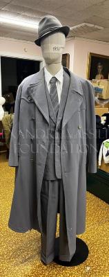 Men's double-breasted trenchcoat made of grey gabardine, with wide notched lapels, raglan sleeves, a fastening with three rows of plastic buttons, gun flap on the right breast, storm flap on the left, and two slit pockets with shaped leaflets. Produced by "Druzhba" factory.