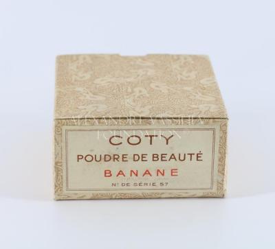 Powder box named "Banane" in its original packaging. The packaging is decorated with repeated pattern of a couple around a table. The background is covered with curves. The box has three pink lines on the bottom and a coat of arms on the top.