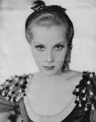 Publicity portrait of Natalie PALEY in costume for the film "The Private Life of Don Juan" (1934). The composition presents a close frontal view of the figure, with the gaze directed intensely toward the viewer, creating a direct and highly controlled studio image. Natalia's hair is arranged in a sleek coiffure drawn back from the forehead, with a decorative ribbon headband tied at the crown, forming a bow and extending into a long trailing element. The facial features are accentuated by pronounced eye makeup, including elongated lashes and defined brows, while the lips are rendered in a darker tone, contributing to the dramatic effect of the portrait.
