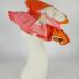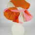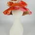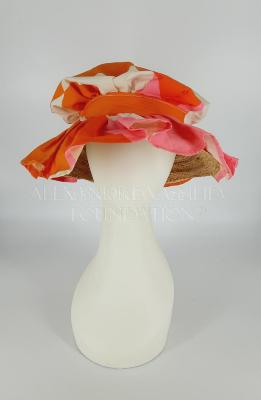 Summer straw hat, overlaid with red and white printed cotton in the style of Tudor flat cap with a flat crown and gathered brim.