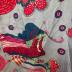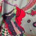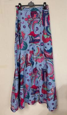Blue longĀ silk skirt with multicoloured print of extravagant ladies