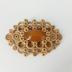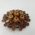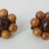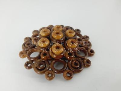 Wooden bijou set: three openwork brooches made of varnished dark brown, red-brown and natural color wooden rings, one with artificial amber in the center. With matching clips made of natural color and dark brown wooden beads in the shape of flower on brass сlip-on pad attachment.