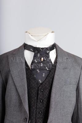 Accompanied by detachable wing collar “F. Georges & Cie / 37 Bd. Capucines Paris” and black silk satin with small woven silver squares tie “Charles E. Johansson Bollnäs”, secured with a pinchbeck pin, embellished with a pearl and rhinestones.