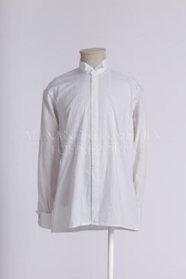 White cotton tuxedo shirt with two-button closed wing tip collar, woven satin stripes along the front placket with hidden fastening, long sleeves with turn-up cuffs, closed with mother-of-pearl cufflinks.