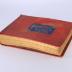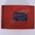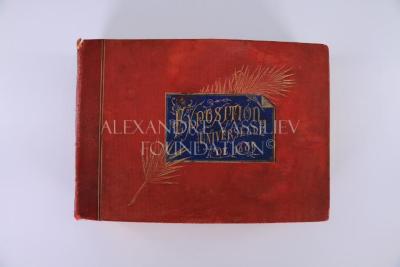 Photo album bound in red leather documenting the 1889 World's Fair. Cover features a blue square and gold lettering with botanical motifs. Contains 40 pages (2 cover pages, 36 photograph pages, 2 blank pages) with black and white photographs depicting key exhibits, pavilions, and scenes from the exposition grounds.