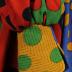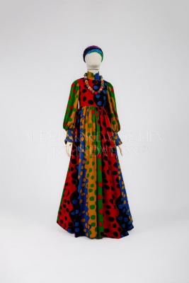 A Jean Muir printed moss-crepe evening gown, the fabric probably by Liberty, printed with bold undulating colour blocks and outsized polka dots.