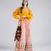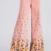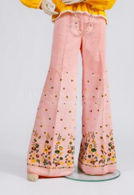 Pink corduroy women's flared trousers satin stitched with yellow and blue floral pattern on the bell bottom legs.
