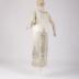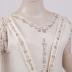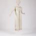Ivory silk satin Art Deco style sheath dress embroidered with white and silver microbeads. Sleeveless, with a boat neckline, armholes edged with double silk satin binding and two long ribbons sewn into the shoulder seams, embroidered with a large medallion in the center front, along the neckline, armholes, and hem, also by the attaching ribbons.