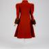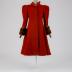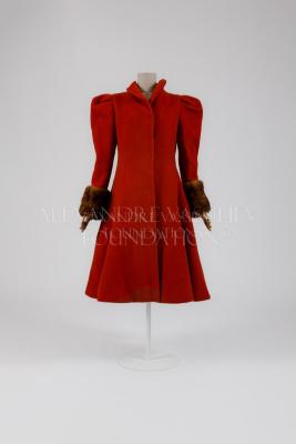 Brick-colored wool cloth winter coat in Russian style, fitted, with a wide skirt and sable fur sleeve cuffs. The coat is one-piece at front, waist cut-off by the sides and at the back, has revere collar, fastens with five covered buttons, the sleeves with a very high gathered caps and widened padded shoulders have high light brown sable cuffs.