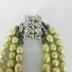 A triple strand necklace of graduated pale green cultured pearls, matinee length, with a white metal rectangular clasp set with transparent rhinestones.