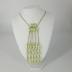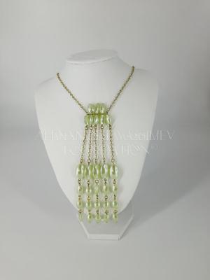A gilded pinchbeck chain with five pendants of graduated pale green nacreous seed-shaped beads, connected with pinchbeck jump rings, which are held with plate of two bead rows, matinee length, has a screw clasp.