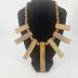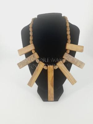 Necklace of wooden spindle-shaped beads and seven rectangular graduated wooden plates in the center, separated by spindle beads, opera length, with screw wooden clasp.