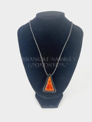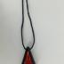 A triangular ceramic pendant made of dark brown clay with orange enamel in the middle, on a leather cord.