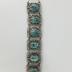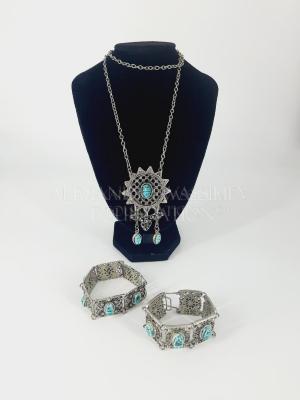 The three-piece "Egyptian Collection" jewelry set with white metal filigree mountings and turquoise ceramic scarabs. Consists of a white metal massive sun-shaped pendant on a long cable chain with a turquoise ceramic scarab mounted in the metal lattice center and two ones hanging below; and two white metal bracelets made of six rectangular parts each: on the first bracelet these parts are located lengthwise, on the second - crosswise, each part has a ceramic scarab mounted in it.