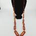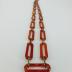 A long, 1960s space-age necklace of oblong amber-colored plastic rings connected with brass hooks.