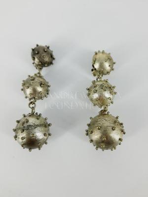 Silvered metal ear clips in the shape of three graduated by size naval spiked mines, 9 cm length.