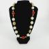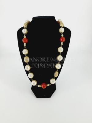 An opera length necklace made of uniform round nacreous white beads with crumpled surfaces, four coral imitating round glass beads, enclosed in small artificial pearls, and four gilded crumpled flat beads, with gilded brass bead cups, connected with brass jump rings and has a hook and eye clasp.