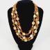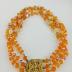 A triple-strand necklace of graduated faceted orange prism beads, ivory onyx imitating odd-shaped glass beads and a few metallic orange round beads, separated by white seed beads, princess length, with pinchbeck bead cups and an openwork box tag insert clasp.
