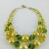 A two-strand necklace of graduated nacreous chartreuse round beads alternated with odd-shaped transparent green and yellow beads, matinee length, featuring a brass leaf hook clasp.