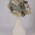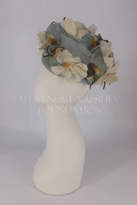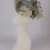 A grey-blue chiffon pillbox hat overlaid on an ivory stiffed mesh base, decorated on top with a blossom apple sprig with white and green-brown silk flowers and green leaves.