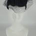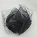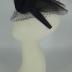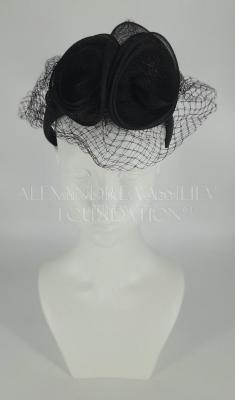 A black silk satin with grosgrain lining fascinator headwear with a black veil, two large roses and a bow tails laid on the crown, which are made of black sisal mesh.