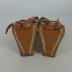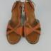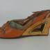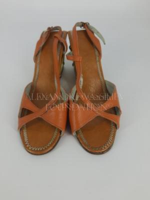 A pair of no-name wedge sandals, handmade of rust-colored leather with crossed vamp stripes, that turn into an asymmetrical back strap, fastened with a small brass buckle; have 7 cm high wood wedges with triangular cutouts, bound with gilded brass; the insole and the wedge at the back are covered with one-piece leather, stitched with linen threads in a wide zigzag.