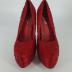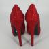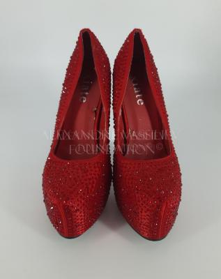 A pair of fetish shoes covered in red silk satin with a scattering of red rhinestones, have a 4.5 cm hidden platform under the toe and 15.5 cm high silk satin covered stiletto heels. Produced for unisex adults and drag queen shows.