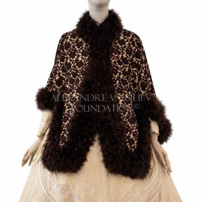 Ivory wool canezou cape with brown carnation print, edged with brown marabou feathers.