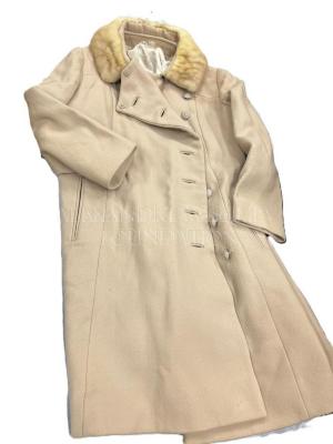 Beige wool flannel women's winter coat with a golden mink fur turn-down collar. This below-the-knee coat features a front yoke, princess seams and vertical welt pockets at the hips, fastens two snaps at the neck and seven tone-on-tone figured plastic buttons with welt loops.